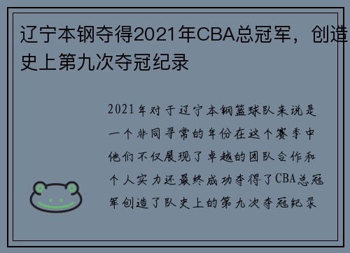 辽宁本钢夺得2021年CBA总冠军,创造史上第九次夺冠纪录,这是一个伟大的时刻,一个值得铭记的时刻。让我们共同期待,辽宁本钢篮球队在未来的赛场上继续书写属于他们的传奇!